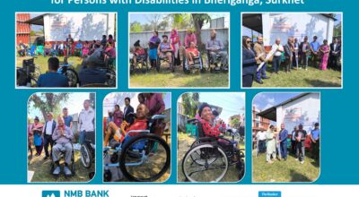 काठमाडौं - एनएमबि बैंकको संस्थागत सामाजिक उत्तरदायित्व अन्तर्गत सुर्खेतको भेरिगङ्गा नगरपालिकामा अपाङ्गता भएका व्यक्तिहरूलाई सहायक