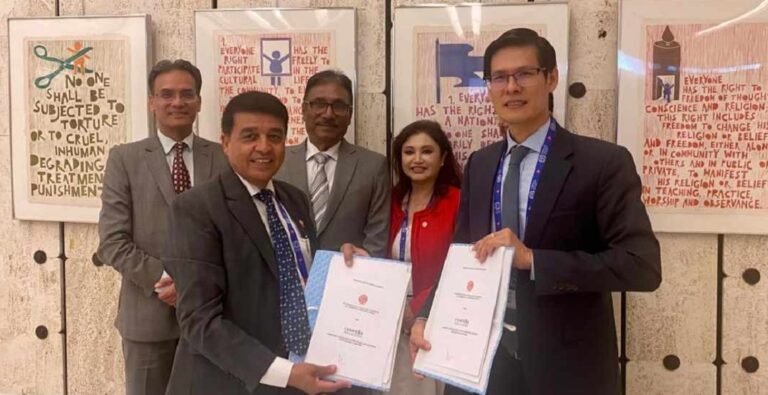 काठमाडौं– नेपाल उद्योग वाणिज्य महासंघ (एफएनसीसीआई) र कम्बोडियन फेडेरेसन अफ एम्प्लोयर्स एन्ड बिजनेस एशोसिएसन ९क्याम्फेबा० का बीच द्विपक्षीय व्यापारिक सहकार्यलाई सुदृढ गर्ने समझदारीपत्रमा हस्ताक्षर भएको छ। श्रम रोजगार तथा सामाजिक सुरक्षा मन्त्री शरत सिंह भण्डारीको उपस्थितीमा महासंघका अध्यक्ष चन्द्र प्रसाद ढकाल र क्याम्फेबाका उपाध्यक्ष सोक लोरले २०२५ जुन १० मा स्वीट्जरल्यान्डको जेनेभामा सो समझदारीपत्रमा हस्ताक्षर गरेका हुन्।