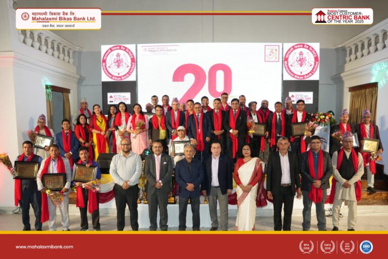 काठमाडौं – महालक्ष्मी विकास बैंकको ३१ औँ वार्षिकोत्सवको अवसरमा २० वर्ष सेवा प्रदान गरेका कर्मचारीहरुलाई एक विशेष कार्यक्रम सहित सम्मान गरिएको छ । बैंकमा इमान्दार, निष्ठा, समर्पण, दायित्वबोध र व्यवसायिकता साथ २० वर्ष सम्म निरन्तर रुपमा बैंकको स्थायित्व, विकास र उत्कृष्टताको यात्रामा महत्वपुर्ण सेवा तथा योगदान पु-याए बापत ३६ जना कर्मचारीहरुलाई काठमाण्डौंमा आयोजित एक विशेष कार्यक्रमका बीच सम्मान गरिएको हो ।