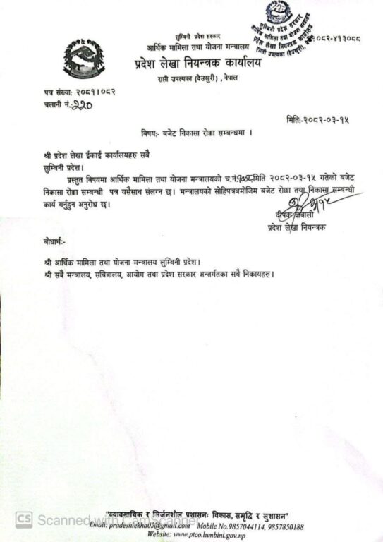 नेपाल सरकारका सशर्त, विशेष र समपूरक अनुदान स्रोतबाट खर्च हुने योजनाहरूको भुक्तानी भने रोकिएको छैन । आर्थिक मामिला तथा योजना मन्त्रालयका वरिष्ठ शाखा अधिकृत सुमन पौडेलले आइतबार प्रदेश कोष लेखा नियन्त्रण कार्यालयलाई पठाएको पत्रमा कर्मचारीहरूको तलब भत्ता, नेपाल सरकार सशर्त, विशेष र समपूरक अनुदान स्रोतबाट खर्च हुने रकम, नेपाल सरकार समपूरक अनुदानमा सञ्चालित आयोजनामा प्रदेश सरकार वित्तीय समानीकरण अनुदान स्रोतबाट बहन गर्नुपर्ने बापतको रकम, नेपाल सरकार सशर्त अनुदान अन्तर्गत वैदेशिक स्रोतबाट सञ्चालित आयोजनामा प्रदेश सरकार स्रोत समानीकरण अनुदानबाट बहन गर्नुपर्ने बापतको रकम, स्थानीय तहलाई गरिने वित्त हस्तान्तरणको रकम र प्रदेश सञ्चित कोषमाथि व्ययभार हुने रकम बाहेकको सबै भुक्तानी रोक्न निर्देशन गरिएको छ ।