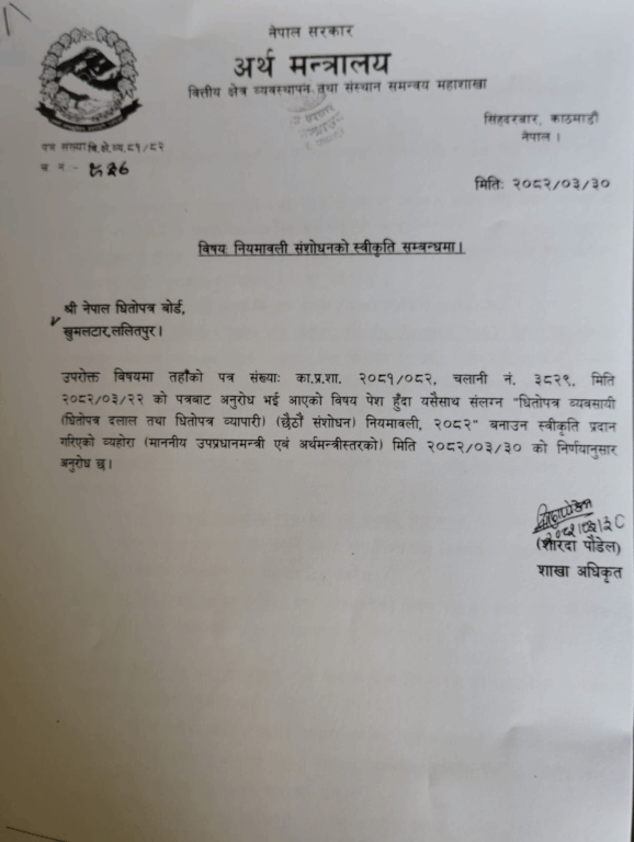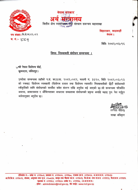 नेपाल धितोपत्र बोर्डलाई सम्बोधन गर्दै मन्त्रालयले २०८१\०८२ पत्र संख्याको सन्दर्भमा प्राप्त प्रस्तावअनुसार विनियमावली संशोधनको स्वीकृति दिएको जनाएको छ।