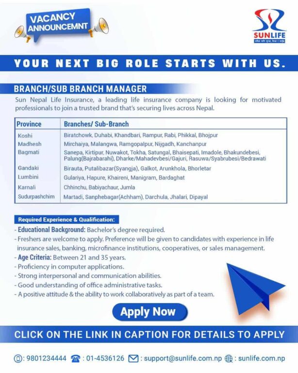 काठमाडौं – सन नेपाल लाइफ इन्स्योरेन्समा रोजगारीको अवसर खुलेको छ । कम्पनीले सातै प्रदेशका लागि कर्मचारी माग गरेको छ । कम्पनीले ब्रान्च म्यानेजर तथा सब ब्रान्च म्यानेजरका लागि कर्मचारी माग गरेको छ । कम्पनीले कोशी, मधेश, बागमती, गण्डकी, लुम्बिनी, कर्णाली र सुदुरपश्चिम प्रदेशका विभिन्न शाखा कार्यालय लागि कर्मचारी माग गरेको हो । ईच्छुक तथा योग्यता पुगेकाले कम्पनीमा सम्पर्क गरी आवेदन दिन सक्नेछन् ।