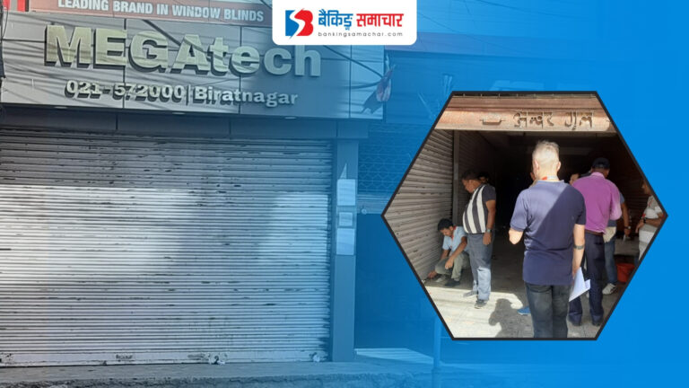 विराटनगर – विराटनगर–७ मेनरोडस्थित सातघुम्तीमा रहेको कम्प्युटर तथा इलेक्ट्रोनिक उपकरणको विक्रेता मेगाटेक सोलुसनको विक्री केन्द्र तथा मर्मत सम्भार कक्षमा नबिल बैंकले सिलबन्दी गरेको दुई दिनपछि ग्लोबल आइएमई बैंकले पनि सिल लगाएको छ । शुक्रबार ग्लोबल आइएमई बैंकले मेगाटेकको बिक्री तथा मर्मत सम्भार कक्षको सटरमा सिक्री बाँधेर सिलबन्दी गरेको हो ।