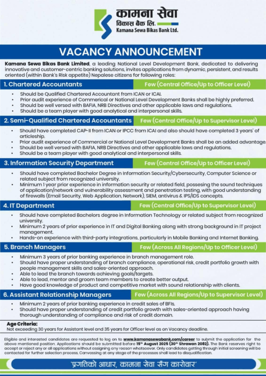 काठमाडौं– कामना सेवा विकास बैंकले विभिन्न ६ पदमा कर्मचारी माग गरेको छ । बैंकले चार्टर्ड एकाउन्टेन्ट्स, सेमी क्वालिफाइड चार्टर्ड एकाउन्टेन्ट्स, इन्फर्मेसन सेक्युरिटी डिपार्टमेन्ट, आईटी डिपार्टमेन्ट, ब्रान्च म्यानेजर्स र असिस्टेन्ट रिलेसनसिप म्यानेजर्समा लगायतका पदमा दरखास्त आह्वान गर्दै कर्मचारी माग गरेको हो ।