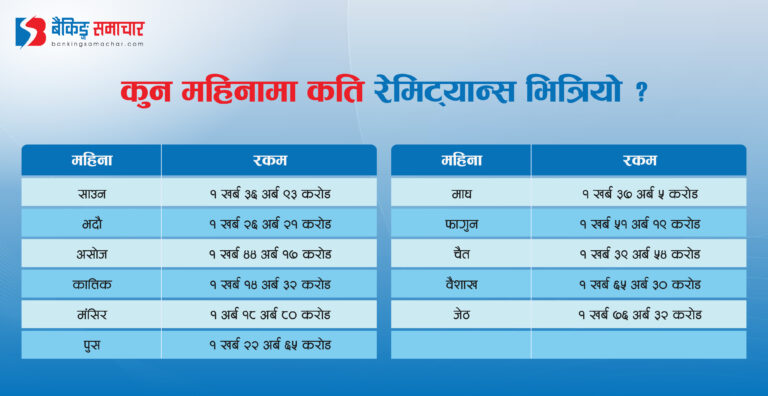 यस्तै, भदौमा एक खर्ब २६ अर्ब २१ करोड रुपैयाँ, असोजमा एक खर्ब ४४ अर्ब १७ करोड, मंसिरमा एक अर्ब १८ अर्ब ८० करोड, पुसमा एक खर्ब २२ अर्ब ६५ करोड, माघमा एक खर्ब ३७ अर्ब पाँच करोड, फागुनमा एक खर्ब ५१ अर्ब १९ करोड, चैतमा एक खर्ब ३९ अर्ब ५४ करोड, वैशाखमा एक खर्ब ६५ अर्ब ३० करोड रुपैयाँ विप्रेषण भित्रिएको थियो ।