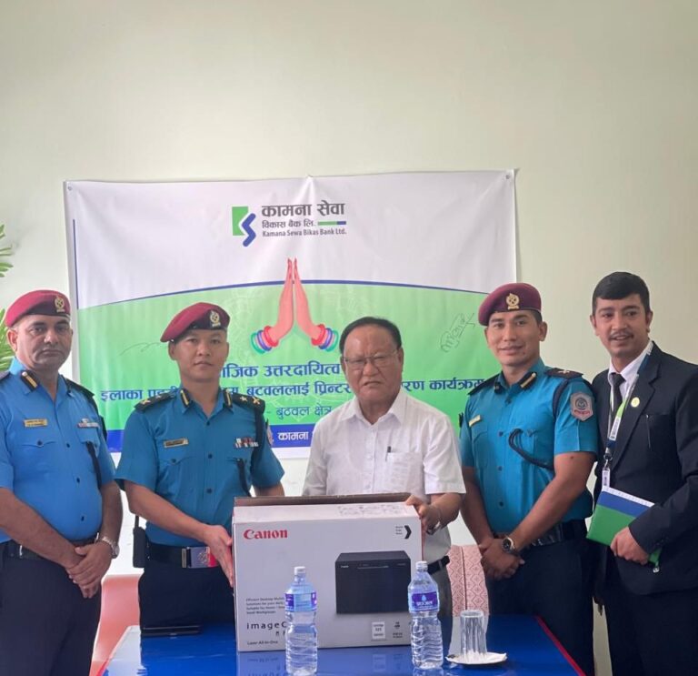 काठमाडौं – कामना सेवा विकास बैंकले आफ्नो सामाजिक उत्तरदायित्व कार्यक्रम अन्तर्गत इलाका प्रहरी कार्यालय, बुटवललाई प्रिन्टर हस्तान्तरण गरेको छ । कामना सेवा विकास बैंकका संचालक भिम प्रसाद तुलाचनले इलाका प्रहरी कार्यालयका प्रमुख प्रहरी नायाब उपरीक्षक इन्द्र बहादुर रानालाई हस्तान्तरण गरे ।
