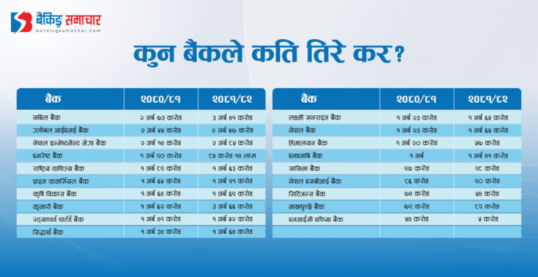 स्ट्यान्डर्ड चार्टर्ड बैंक १ अर्ब ५२ करोड, सिद्धार्थ बैंकले १ अर्ब ६४ करोड, लक्ष्मी सनराइज बैंकले १ अर्ब ६५ करोड, नेपाल बैंक १ अर्ब ६५, हिमालयन बैंक ५७ करोड ३८ लाख एनएमबि बैंक १ अर्ब ४१ करोड, सानिमा बैंकले ९८ करोड ७९ लाख, नेपाल एसबीआई बैंक ९० करोड ७४ लाख, सिटिजन्स बैंक ५४ करोड ५१ लाख, माछापुच्छ्रे बैंकले ८९ करोड २८ लाख, एभरेष्ट बैंक ८४ करोड १४ लाख र एनआईसी एशिया बैंक ५ करोड ५१ लाख कर तिरेका छन् ।