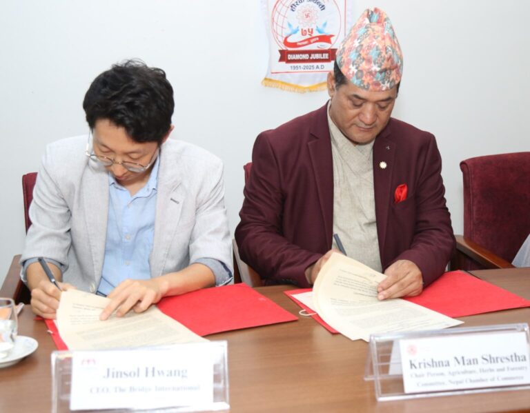 काठमाडौं – कृषि, जडिबुटी तथा बन समिति चेम्बर अफ कमर्स र दक्षिण कोरियाको ब्रिज इन्टरनेशनलबीच कृषि व्यवसाय विस्तार र साना तथा मझौला उद्यम SMEs को विकासका लागि सहकार्य गर्ने सम्झौता भएको छ ।