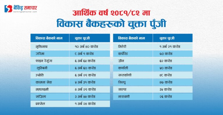 त्यसैगरी, शाइन रेसुंगा डेभलपमेन्ट बैंकको चुक्ता पुँजी ६ अर्ब ६५ करोड रुपैयाँ, ज्योति विकास बैंकले ६ अर्ब २९ करोड रुपैयाँ, महालक्ष्मी विकास बैंकको ४ अर्ब २९ करोड रुपैयाँ, लुम्बिनी विकास बैंकको ६ अर्ब ६० रुपैयाँ, सांग्रिला डेभलपमेन्ट बैंकको ३ अर्ब ५५ करोड रुपैयाँ, कामना सेवा विकास बैंकको ५ अर्ब ३१ करोड रुपैयाँ, मितेरी डेभलपमेन्ट बैंकको १ अर्ब २१ करोड रुपैयाँ चुक्ता पुँजी रहेको छ ।