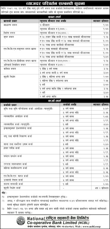 यस्तै, एनसीबीएल समुन्नत बचत खातामा न्यूनतम १.२५ प्रतिशतदेखि अधिकतम १.५० प्रतिशत, एनसिबिएल प्रिमियम बचतमा १.२५ प्रतिशत, अनिवार्य नियमित बचतमा ४ प्रतिशत र क्रमिक बचतमा ३.२५ प्रतिशतदेखि ३.५० प्रतिशतसम्म ब्याजदर निर्धारण गरेको बैंकले जनाएको छ । यस्तै, बैंकको मुद्दती निक्षेपमा न्यूनतम २ प्रतिशतदेखि अधिकतम ३.७५ प्रतिशतसम्म ब्याजदर तोकिएको छ ।