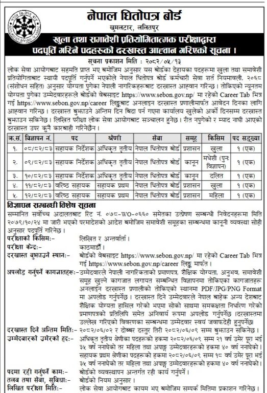 दोब्बर दस्तुर तिरेर भने असोज ९ गतेसम्म पनि दरखास्त दिन सकिने छ । खुला तथा समावेशी प्रतियोगितात्मक परीक्षाद्वारा पदपूति गरिने भन्दै बोर्डले आज सूचना निकालेर इच्छुकबाट दरखास्त माग गरेको हो।