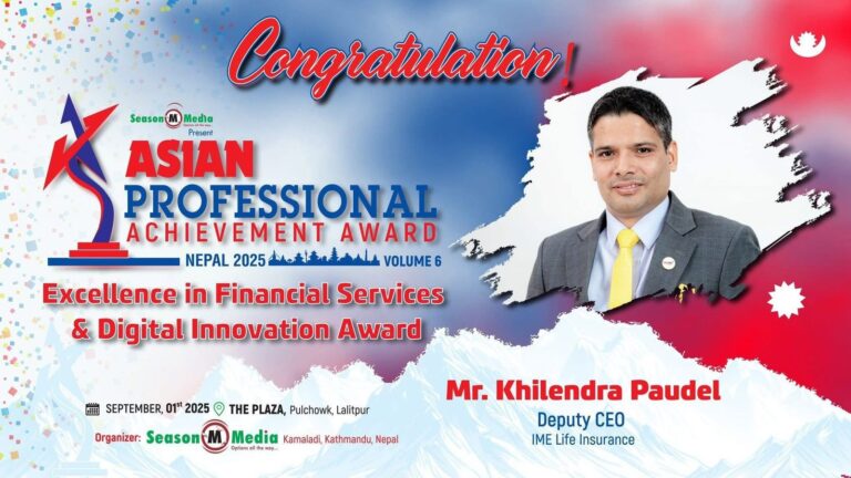 काठमाडौं – आईएमई लाइफ इन्स्योरेन्स कम्पनीका नायव प्रमुख कार्यकारी अधिकृत खिलेन्द्र पौडेल वित्तीय सेवा र डिजिटल नवप्रवर्तनमा उत्कृष्टता पुरस्कार २०२५ बाट सम्मानित भएका छन्। सिजन मिडियाद्वारा आयोजित छैटौँ एसियन प्रोफेसनल एचिभमेन्ट अन्तर्गत उनले वित्तीय सेवा र डिजिटल नवप्रवर्तनमा पुर्याएकाे याेगदान स्वरूप साे पुरस्कार पाएका हुन्।