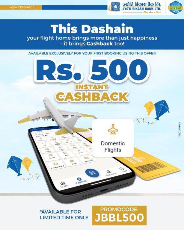 यस योजनाअन्तर्गत, ग्राहकहरूले ज्योति स्मार्ट एप प्रयोग गरी जुनसुकै घरेलु एयरलाइन्सको हवाई टिकट खरिद गर्दा ५०० रूपैयाँसम्मको सर्वाधिक क्यासब्याक प्राप्त गर्न सक्नेछन्। ज्योति स्मार्ट App बाट हवाई टिकट खरिद गर्दा ‘JBBL500’प्रोमो कोड प्रयोग गरी उक्त क्यासब्याक सुविधाको लाभ उठाउन सकिन्छ। साथै, पहिलो ४०० जना मात्र यो अफरबाट लाभान्वित हुन सक्नेछन्।