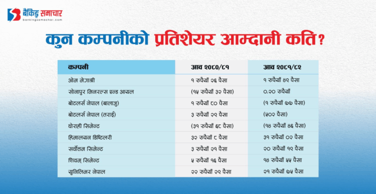 यी दुई सिमेन्ट कम्पनीहरूले अघिल्लो आवको तुलनामा गत आवमा प्रतिशेयर आम्दानीमा उल्लेख्यरुपले सुधार गरेका छन्। यससँगै ओम मेगाश्री फर्मास्युटिकल्स, युनिलिभर नेपाल र हिमालयन डिष्टिलरी कम्पनीहरूको प्रतिशेयर आम्दानीमा भने खासै घटबढ नआएको तथ्यांकले देखाउँछ। तर, यीबाहेक अन्य ३ कम्पनीहरूको प्रतिशेयर आम्दानी भने गिरावट आएको छ।
