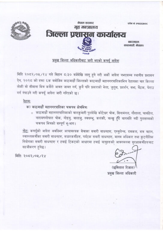 प्रमुख जिल्ला अधिकारी छलिलाल रिजालद्वारा स्थानीय प्रशासन ऐन, २०२८ को दफा ६ (क) बमोजिम आज बिहान ८ः३० बजेदेखि अर्को आदेश नभएसम्मका लागि कफ्र्यू आदेश जारी गरेका हुन् ।