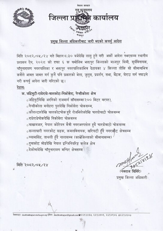 भक्तपुर- भक्तपुर जिल्ला प्रशासन कार्यालयले जिल्लामा निषेधाज्ञा जारी गरेको छ । आज बिहान ८ः३० बजेदेखि लागू हुने निषेधाज्ञा अर्को आदेश जारी नभएसम्मका लागि जारी गरिएको आदेशमा तोकिएको निर्धारित क्षेत्रमा कुनै पनि प्रकारका सभा, जुलुस, प्रदर्शन, बैठक र भीड गर्न रोक लगाइएको छ ।