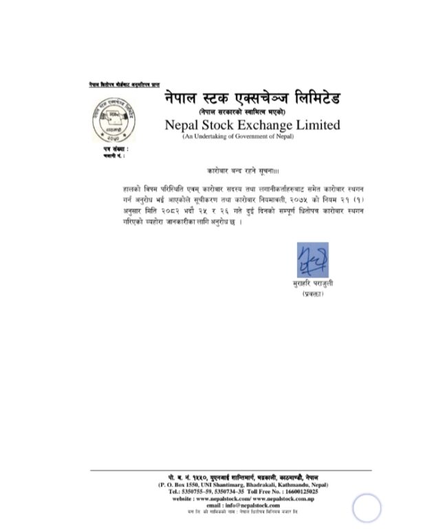 ‘हालको विषम परिस्थिति एवं कारोबार सदस्य तथा लगानीकर्ताबाट कारोबार स्थगन गर्न अनुरोध भएकाले सूचीकरण तथा कारोबार नियमावली २०७५ को नियम २१ (१) अनुसार २०८२ भदौ २५ र २६ गते सम्पूर्ण धितोपत्र कारोबार स्थगन गरिएको छ’, नेप्सेले आज सार्वजनिक गरेको सूचनामा भनेको छ ।