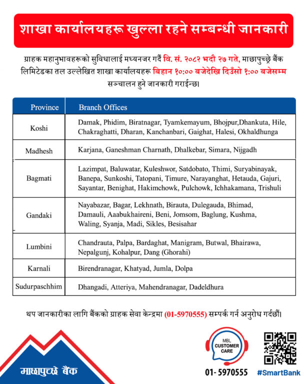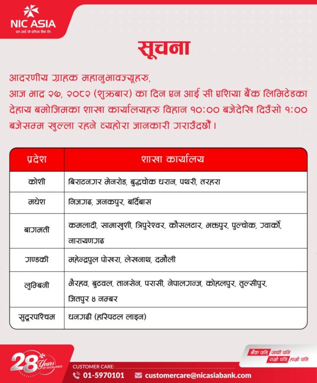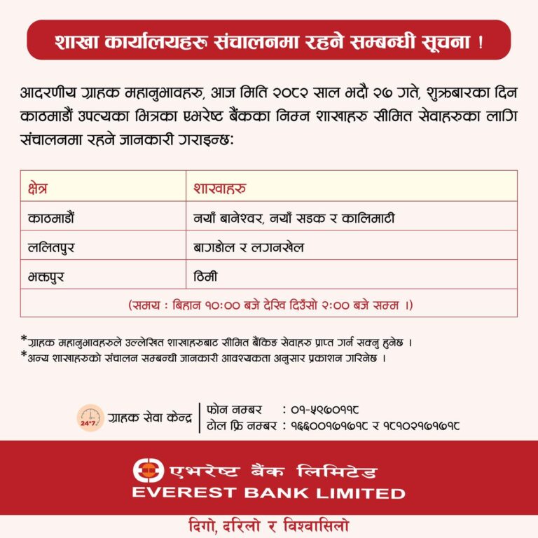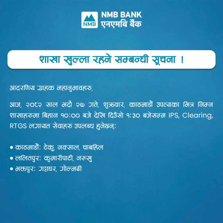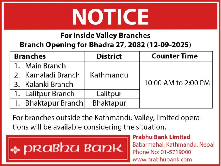काठमाडौं – आज अर्थात् भदौ २७ गते वाणिज्य बैंक तथा वित्तीय संस्थाले आंशिक शाखाहबाट बैंकिङ्ग सेवा दिने भएका छन् । देशको स्थिती सामान्य नबन्दा पनि बैंकहरुले भने ग्राहकको असुविधालाई मध्यनजर गर्दै बैंकिङ्ग सेवा दिन लागेका हुन् ।