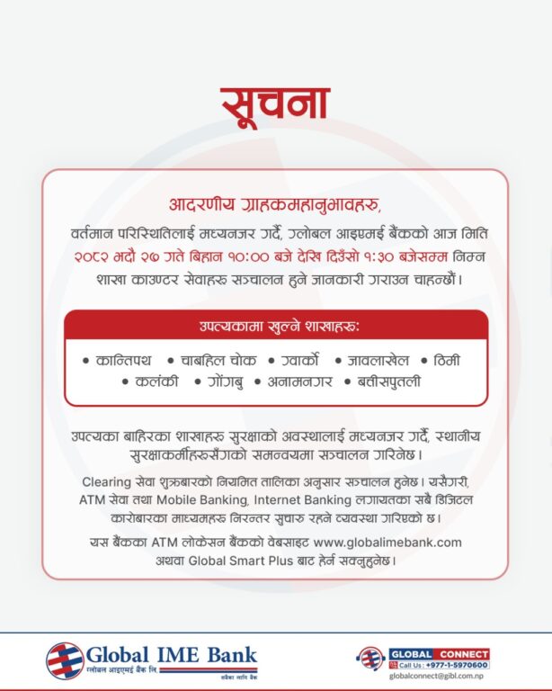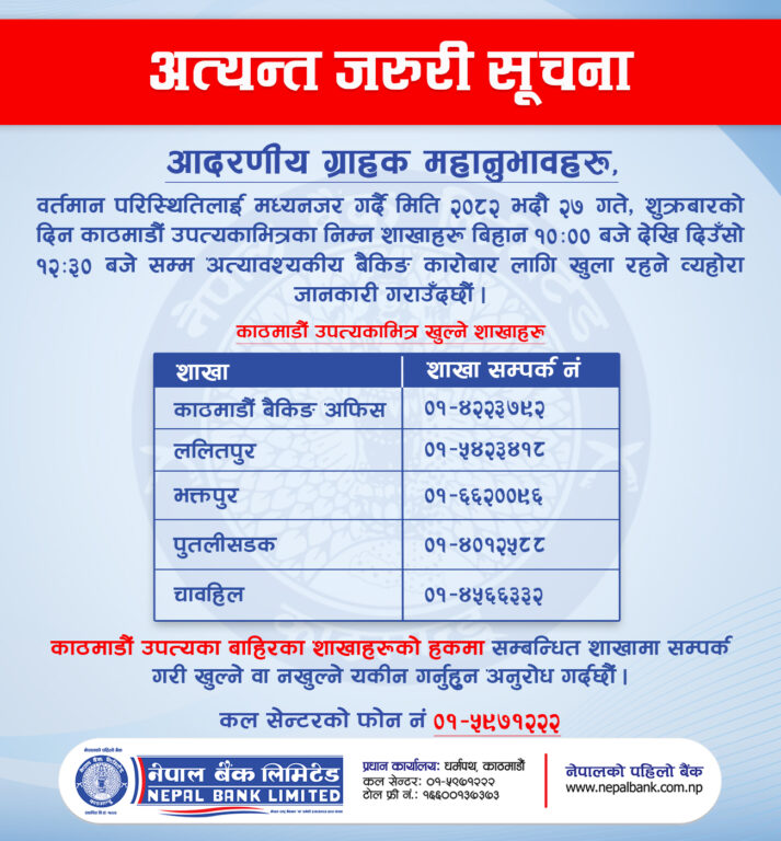 बैंकहरुले उपत्यका बाहिरका शाखाहरु सुरक्षा अवस्थालाई मध्यनजर गर्दै स्थानीय सुरक्षा निकायहरुसँगको समन्वयमा सञ्चालन गर्ने बताएका छन् ।