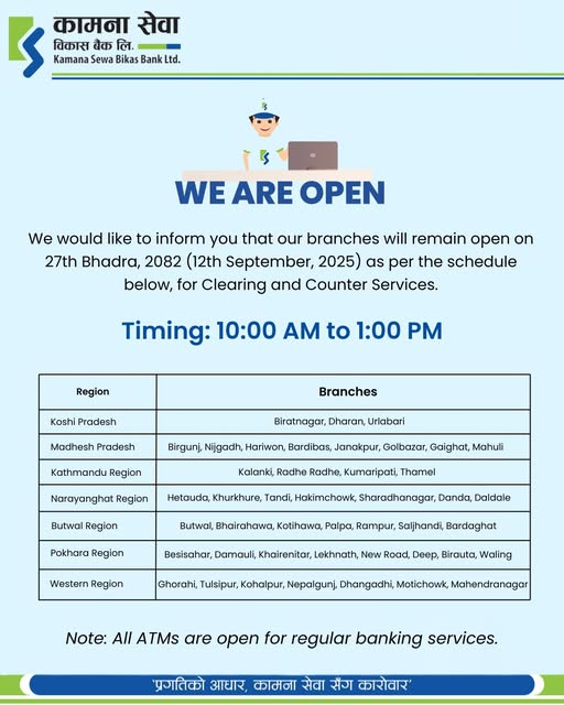 नेपाल बैंकर्स एशोशिएसनले बैंक तथा वित्तीय संस्था बिहान १० बजेदेखि दिउँसो २ बजेसम्म सञ्चालन गर्ने निर्णय गरेको थियो सोहिअनुसार बैंकहरुले बैंकिङ्ग सेवा प्रदान गर्ने भएका हुन् । बैंकहरुले सम्भव भएसम्म डिजिटल बैंकिङ्ग सेवा प्रयोग गर्न ग्राहकहरुलाई आग्रह गरेका छन् ।