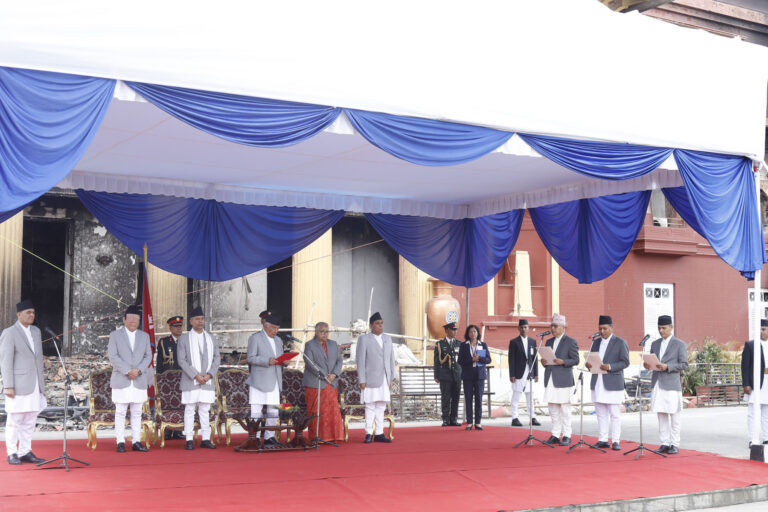 काठमाडौं – नवनियुक्त तीन मन्त्रीहरुले आज पद तथा गोपनीयताको शपथ लिएका छन् । राष्ट्रपति रामचन्द्र पौडेलले राष्ट्रपति कार्यालय शीतल निवासमा आज आयोजित विशेष समारोहमा नवनियुक्त मन्त्रीहरु रामेश्वर खनाल, कुलमान घिसिङ र ओमप्रकाश अर्याललाई शपथ गराएका हुन् ।
