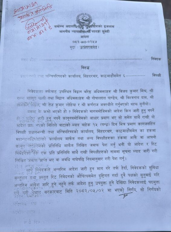 निवेदकको तर्फबाट वरिष्ठ अधिवक्ताहरु विजय कुमार मिश्र, सम्म बहादुर खाती तथा अधिवक्ताहरु गोपालदत्त पाण्डेय, विश्वनाथ दास, लोईङ्गरि डिल, तेज कुमार लोहिया र कर्णराज अवस्थीले बहस गरेका थिए ।