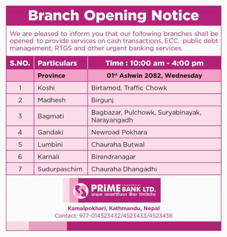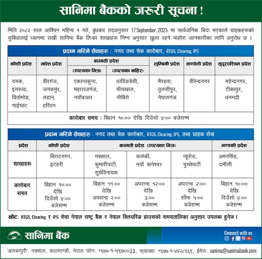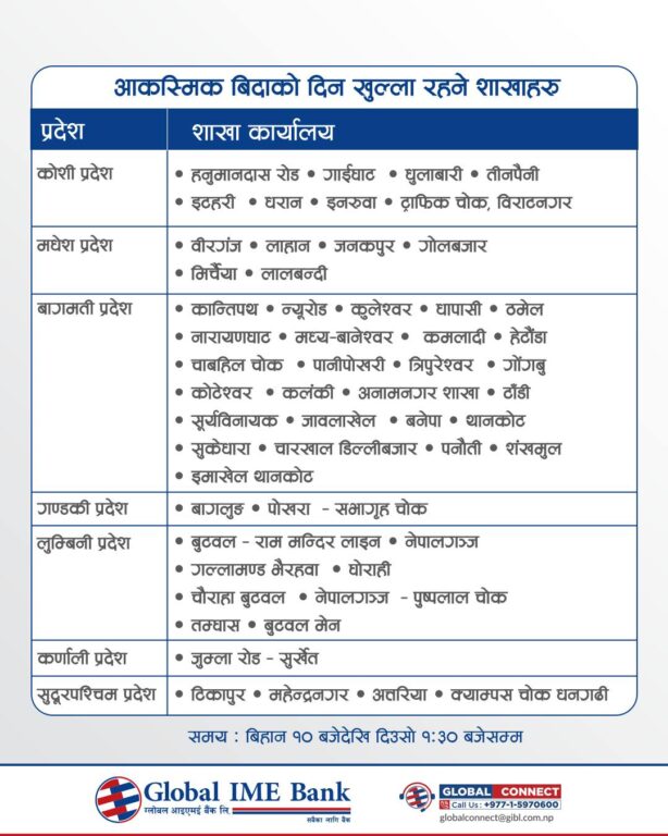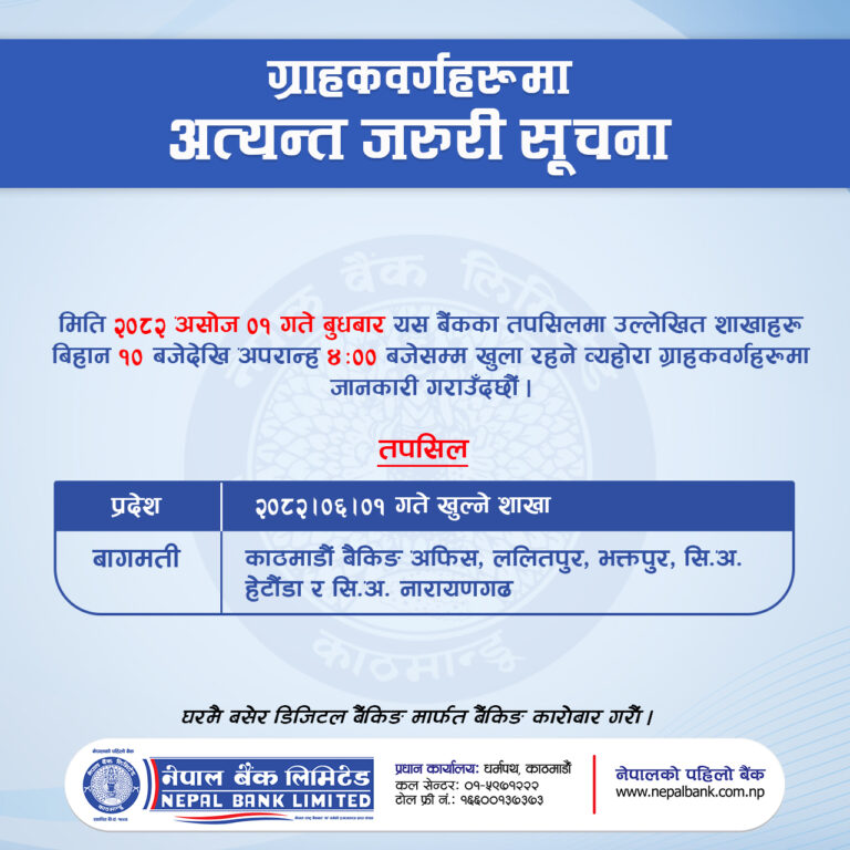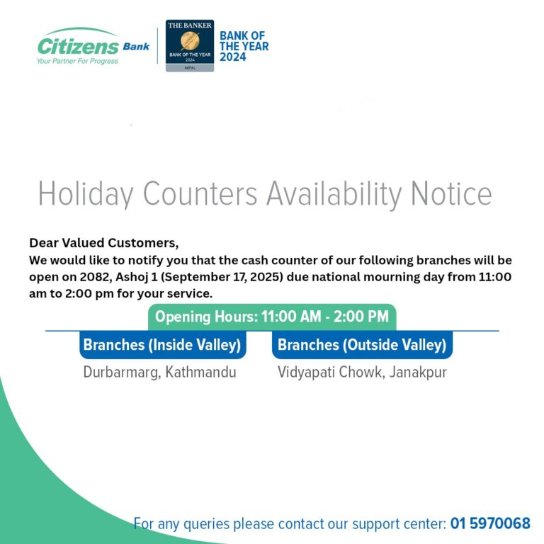 काठमाडौं – आज सार्वजनिक बिदाको दिनपनि बैंकहरुले आंशिक शाखाबाट बैंकिङ्ग सेवा दिने भएका छन् । बैंकहरुले ग्राहकको सुविधालाई ध्यानमा राख्दै सार्वजनिक बिदाको दिनपनि बैंकिङ्ग सेवा दिने भएका हुन् ।