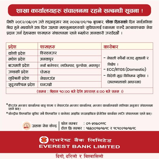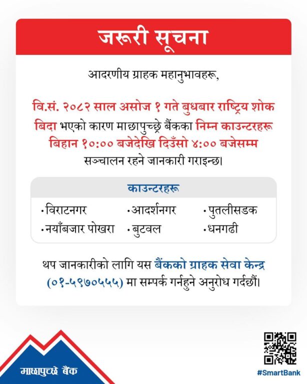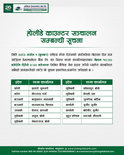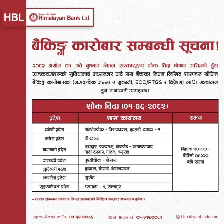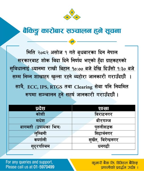 सरकारले आज बुधबार (असोज १ गते) शोक दिवस मनाउने निर्णय गरेर सार्वजनिक बिदा दिएको हो । बैंकहरुले होलिडे काउन्टरमार्फत निक्षेप संकलन र भुक्तानी, विदेशी मुद्रा विनिमय सुविधा दिनेछन् ।