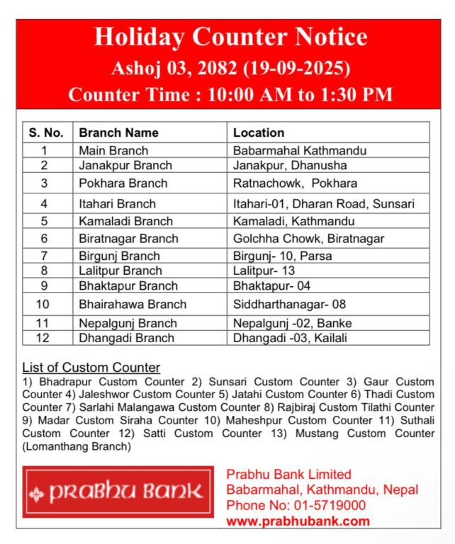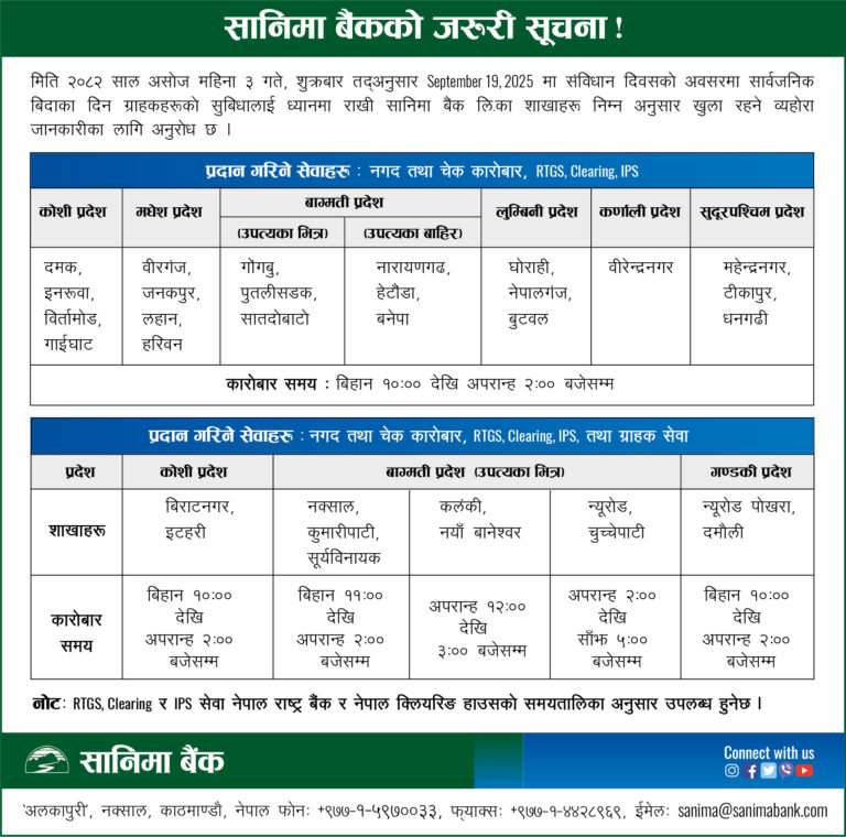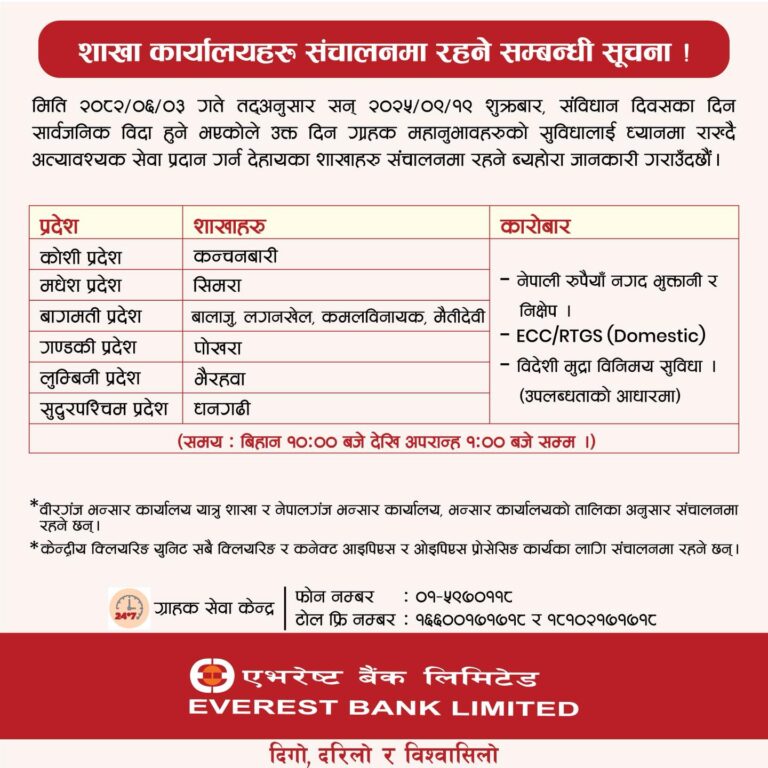 काठमाडौं – बैंकहरुले आज संविधान दिवसको अवसरमा सार्वजनिक बिदा हुँदा पनि बैंकिङ्ग सेवा दिने भएका छन् । बैंकहरुले आंशिक शाखाहरुबाट बेंकिङ्ग सेवा दिन लागेका हुन् ।