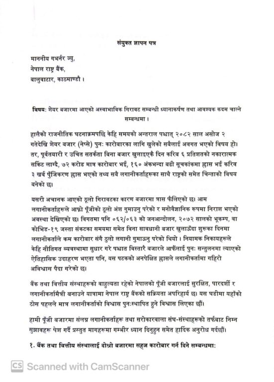 यसरी अचानक शेयर बजारमा आएको ठुलो गिरावटका कारण बजारमा त्रास फैलिनुसँगै आम लगानीकर्ताहरूले आफ्नो पुँजीको ठुलो अंश गुमाउनु परेको र मनोवैज्ञानिक रूपमा निराश भएको अवस्था रहेको बताएका छन् ।यस्तो अवस्थामा नेपाल राष्ट्र बैंकको ठोस पहलले मात्र लगानीकर्ताको विश्वास पुनः स्थापित हुने विश्वास लगानीकर्ताहरूले राखेका छन् । यसै विषयमा पुँजी बजारमा संलग्न लगानीकर्ताहरू तथा सरोकारवाला संघ -संस्थाहरूको तर्फबाट गभर्नरलाई ६ बुँदे सुझावहरू दिएका छन्