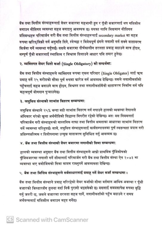 साथै, बैंक तथा वित्तीय संस्थाहरूलाई शेयर बजारमा सहभागी हुन र पुँजी बजारलाई थप गतिशील बनाउन नीतिगत व्यवस्था सहज बनाइनु आवश्यक छ। यसका लागि विद्यमान नीतिगत प्रतिबन्धहरू परिमार्जन गरी बैंक तथा वित्तीय संस्थाहरूलाई सहज रूपमा खरिद र विक्री गर्न अनुमति दिने, स्वेच्छा र विवेकपूर्ण ढंगले लगानी गर्न सक्ने वातावरण सिर्जना गर्ने व्यवस्था गर्ने यसले बजारमा दीर्घकालीन तरलता प्रवाह बढाउने मात्र होइन, सम्पूर्ण पुँजी बजारलाई स्थायित्व र विश्वास दिलाउने आधार पनि तयार हुने लगानीकर्ताको सुझाव छ ।