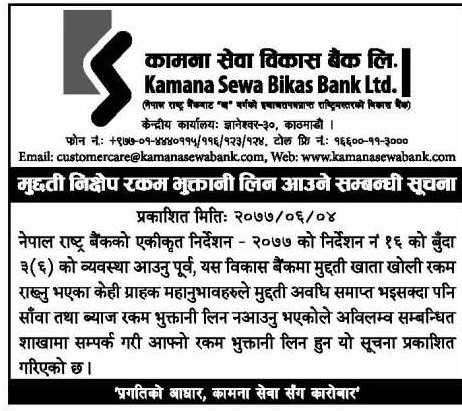 बैंकद्वारा जारी सूचनामा भनिएकाे छ, ‘नेपाल राष्ट्र बैंकको एकीकृत निर्देशन २०७७ को निर्देशन नं १६ को बुँदा ३(६) को व्यवस्था आउनु अगावै बैंकमा मुद्दती खाता खोली रकम राखेका केही ग्राहकहरूले मुद्दती अवधि समाप्त भइसक्दा पनि साँवा तथा व्याज रकम भुक्तानी लिन नआएका ग्राहकहरूलाई आफ्नो रकम भुक्तानी लिन नआउनु भएकाले अविलम्व सम्बन्धित शाखामा सम्पर्क गरी आफ्नाे रकम भुक्तानी लिन हुन अनुराेध गर्दछाैँ’