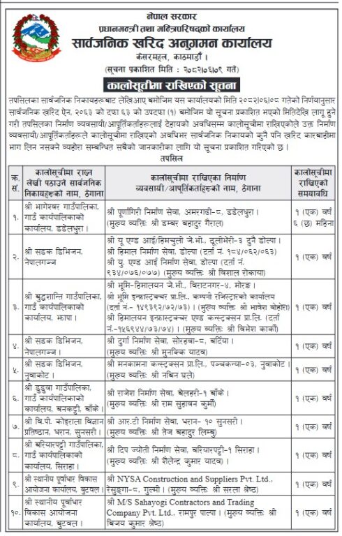 प्रधानमन्त्री कार्यालय मातहतको कार्यालयले आज सूचना जारी गर्दै विभिन्न निकायबाट कालो सूचीमा राख्नको लागि लेखि पठाएअनुसार ती निर्माण कम्पनीलाई कालो सूचीमा राखिएको जानकारी दिएको हो।