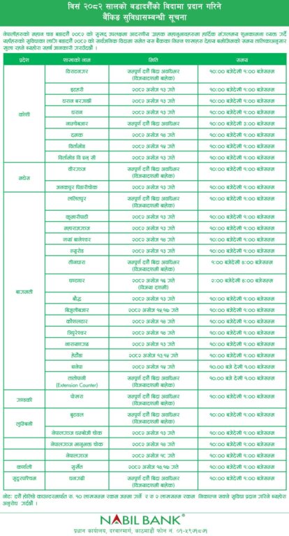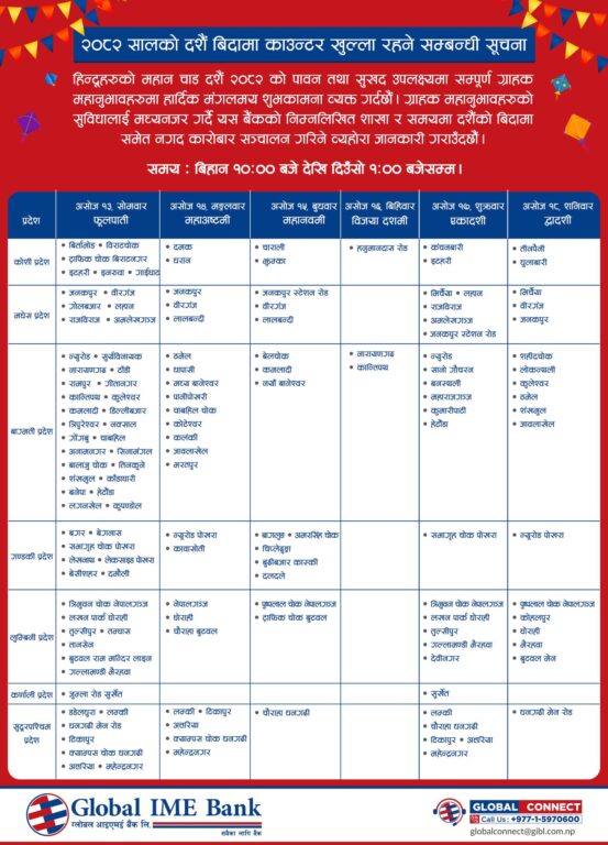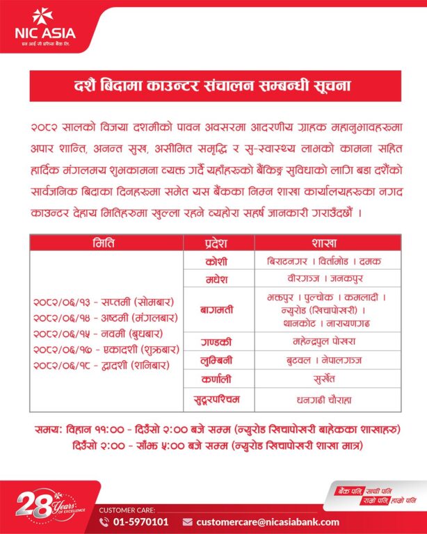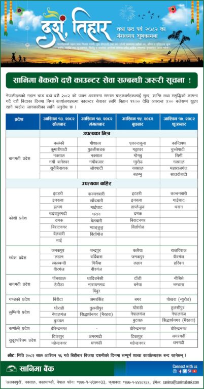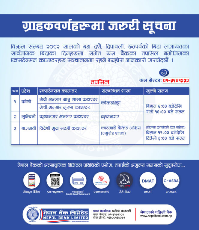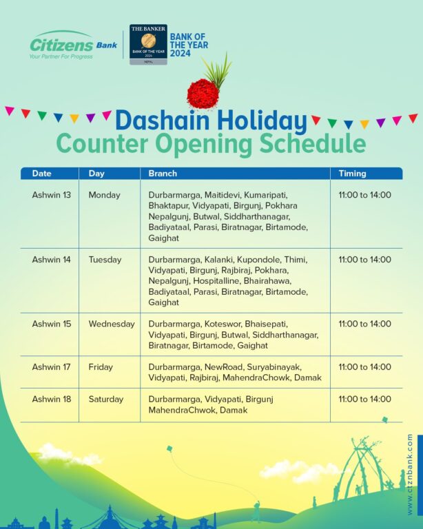 बैंकहरुले काठमाडौं उपत्यका र उपत्यका बाहिरका प्रमुख सहरमा दसैं बिदामा शाखा सञ्चालन गर्ने भएका हुन् । बैंकहरुले दसैंको समयमा नगद कारोबार मात्रै गर्ने भएका छन् भने सकेसम्म डिजिटल कारोबार गर्न आग्रह गरेको छ ।