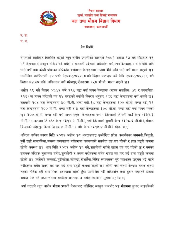 बङ्गालको खाडीबाट विकसित भएको न्यूनचापीय प्रणालीका कारण यही असोज १७ गतेदेखि आज बिहानसम्म सक्रिय रहेको तथा त्यसबाट देशका विभिन्न भागमा परेको प्रभावबारे विभागले जानकारी दिएको छ ।