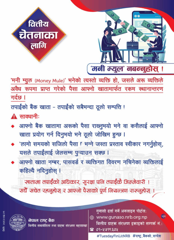 काठमाडौं – नेपाल राष्ट्र बैंकले ‘मनी म्युल’ नबन्न सर्वसाधारणलाई सुझाव दिएको छ। केन्द्रीय बैंकले मंगलबार वित्तीय चेतनाका लागि एउटा सूचना जारी गर्दै ‘मनी म्युल’ नबन्न आग्रह गरेको हो। अरु व्यक्तिले अवैध रुपमा प्राप्त गरेको पैसा आफ्ना खातामार्फत रकम स्थानान्तरण गर्ने व्यक्तिलाई ‘मनी म्युल’ भनिन्छ।
