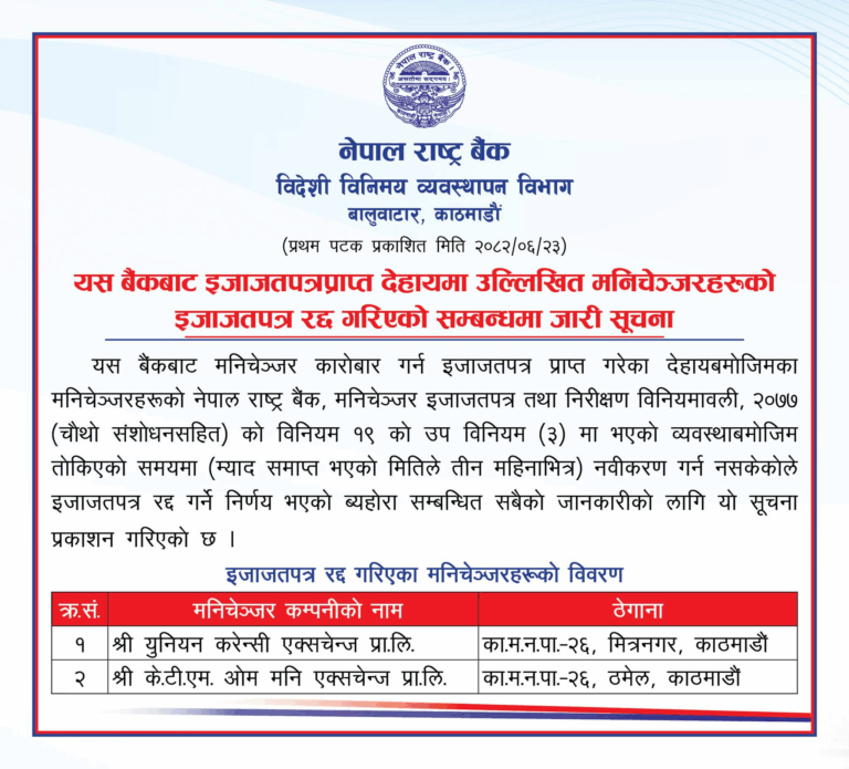काठमाडौं – नेपाल राष्ट्र बैंकले दुई मनिचेञ्जर कम्पनीको इजाजतपत्र रद्द गरेको छ। बैंकका अनुसार तोकिएको समयमा इजाजतपत्र नवीकरण नगरेका कारण उनीहरूको अनुमति रद्द गरिएको हो।