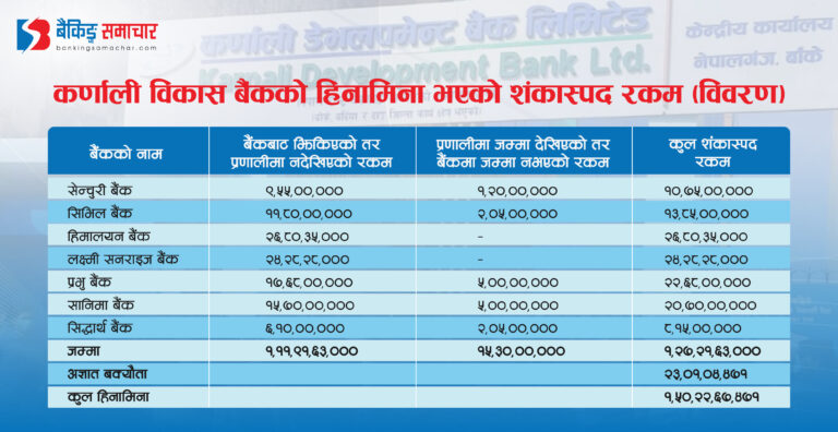 काठमाडौं – कर्णाली डेभलपमेन्ट बैंक लिमिटेडको वित्तीय परीक्षण (ड्यू डिलिजेन्स रिपोर्ट) प्रतिवेदनले बैंक गम्भीर आर्थिक संकटमा फसेको देखाएको छ । लेखापरीक्षक संस्था सञ्जय चौधरी एन्ड एसोसिएट्सद्वारा तयार गरिएको प्रतिवेदन अनुसार बैंकको सम्पत्ति ऋणको अनुपातमा निकै कम हुँदा बैंकको खुद सम्पत्ति (नेट वर्थ) ऋणात्मक देखिएको छ ।