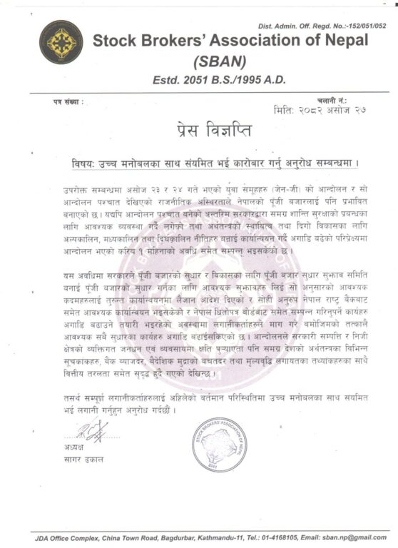 साथै असोज २३ र २४ गते भएको युवा समूहहरु (जेन–जी) को आन्दोलन र सो आन्दोलन पश्चात देखिएको राजनीतिक अस्थिरताले नेपालको पुँजी बजारलाई प्रभावित बनाएपनि अन्तरिम सरकारद्वारा समग्र शान्ति सुरक्षाको प्रबन्धका साथै अर्थतन्त्रको स्थायित्व तथा दिगो विकासका लागि अल्पकालिन, मध्यकालिन तथा दिर्घकालिन नीतिहरु बनाई कार्यान्वयन गर्दै अघि बढेकाले अबका दिनमा लगानीहकर्ताहरु हतास हुन नपर्ने उनको भनाइ छ ।