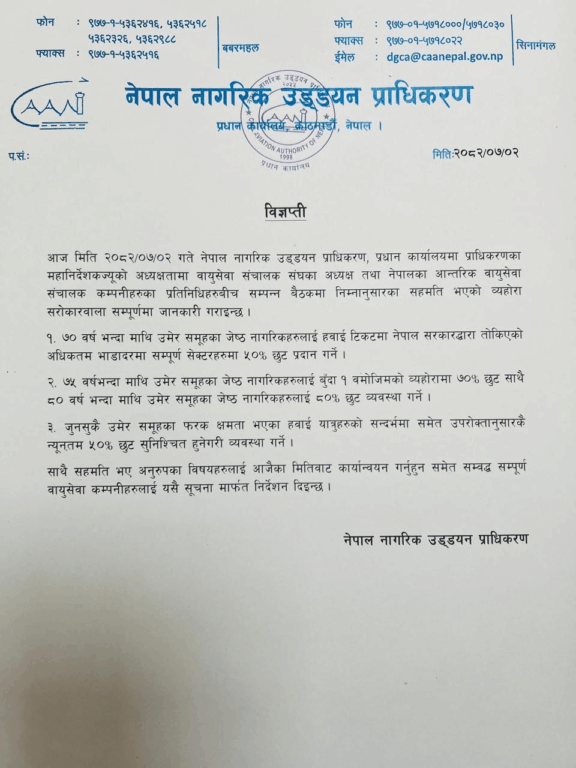 नेपाल नागरिक उड्डयन प्राधिकरण (क्यान) का महानिर्देशक एवं इञ्जिनियर प्रदीप अधिकारीको अध्यक्षतामा वायुसेवा सञ्चालक सङ्घका अध्यक्ष र नेपालका आन्तरिक वायुसेवा सञ्चालक कम्पनीका प्रतिनिधिबीच भएको बैठकले उक्त निर्णय गरेको हो । बैठकले ७० वर्षभन्दा माथिका ज्येष्ठ नागरिकलाई सङ्घीय सरकारद्वारा तोकिएको अधिकतम हवाई भाडादरमा सम्पूर्ण आन्तरिक हवाइमार्गमा ५० प्रतिशत छुट प्रदान गर्ने निर्णय गरेको महानिर्देशक अधिकारीले जानकारी दिए ।