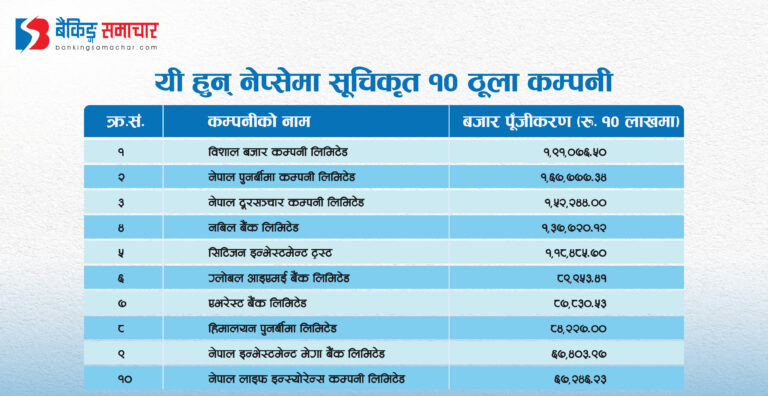 शीर्ष १० कम्पनीमध्ये बैंकिङ्ग र बीमा क्षेत्रका कम्पनीहरू हाबी देखिएका छन् । ग्लोबल आइएमई बैंक, एभरेस्ट बैंक, हिमालयन रिइन्स्योरेन्स कम्पनी, नेपाल इन्भेस्टमेन्ट मेगा बैंक (एनआइएमबी) र नेपाल लाइफ इन्स्योरेन्स कम्पनी पनि ठुलो बजार पुँजीकरण भएका कम्पनीहरूको सूचीमा परेका छन् ।