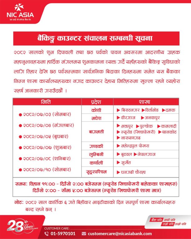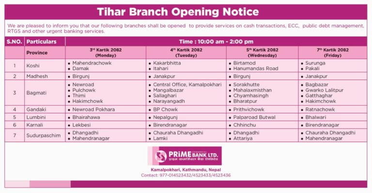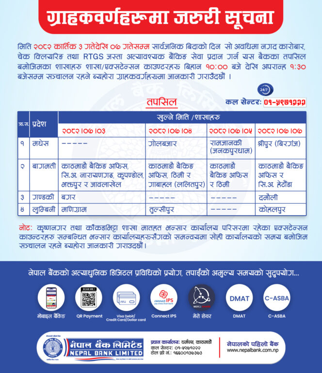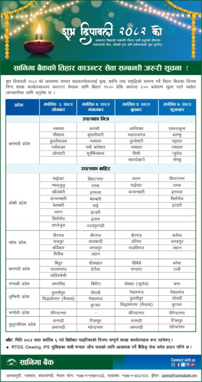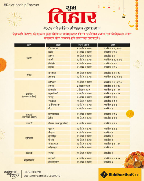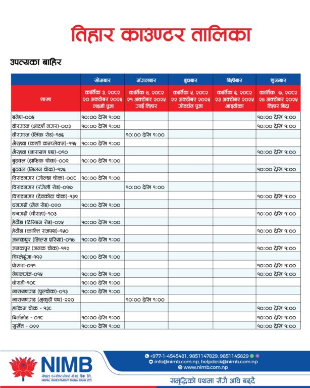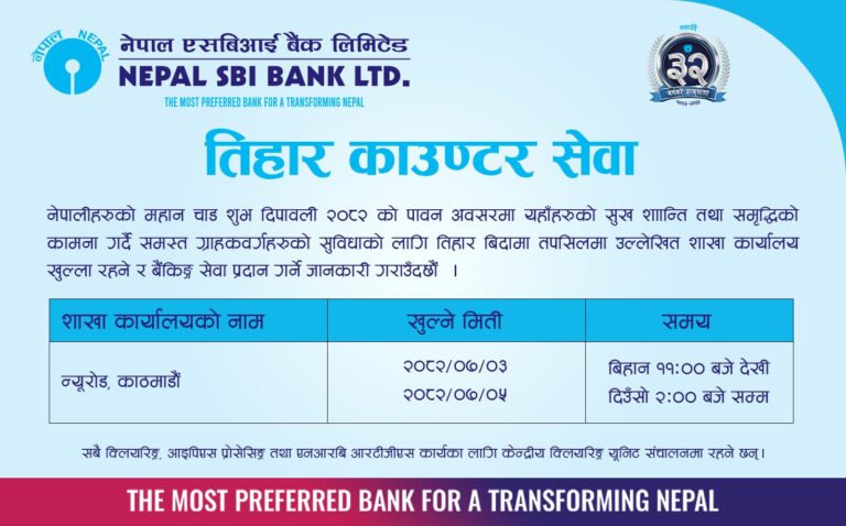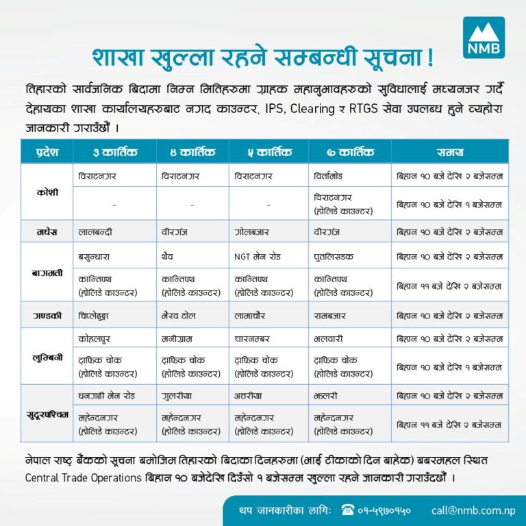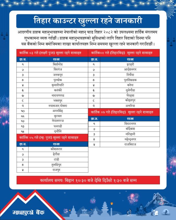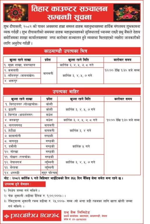 काठमाडौं – यतिबेला नोपालीहरुको दोस्रो ठूलो चाड तिहार सुरु भइसकेको छ । तिहारको अवसरमा सार्वजनिक बिदा रहेको छ । यता सार्वजनिक बिदाका दिन समेत बैंकहरुले भने बैंकिङ्ग सेवादिइरहेका छन् ।