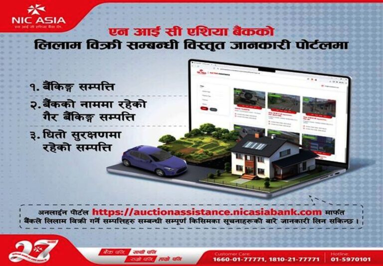 काठमाडौं – एनआईसी एशिया बैंकले सञ्चालनमा ल्याएको लिलाम बिक्रीसम्बन्धी विस्तृत जानकारी गराउने अनलाइन पोर्टलमा बैंकले लिलाम बिक्री गर्ने सम्पत्तिहरूसम्बन्धी सम्पूर्ण किसिमका सूचनाहरूका बारेमा विस्तृत जानकारी समेटिएको जनाएको छ।