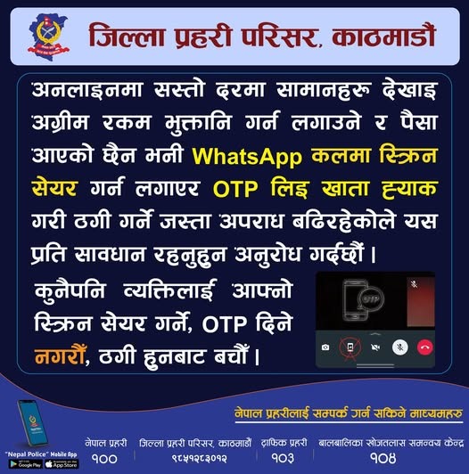 प्रहरीले कुनै पनि व्यक्तिलाई स्क्रिन सेयर गर्ने, ओटिपी दिने जस्ता कार्यहरू नगर्न जिल्ला प्रहरी परिसरले काठमाडौंले अनुरोध गरेको छ ।