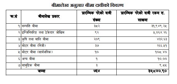 साथै, नेपाल इन्स्योरेन्समा १२ करोड १० लाख, प्रभु इन्स्योरेन्समा १० करोड ६९ लाख, सानिमा जिआईसी इन्स्योरेन्समा १० करोड ४६ लाख बराबरको दावी परेको छ । यता लघु निर्जीवन कम्पनी ट्रस्ट माइको इन्स्योरेन्समा ८ लाख र स्टार माइको इन्स्योरेन्समा ८ लाखको बीमा दावी परेको छ ।