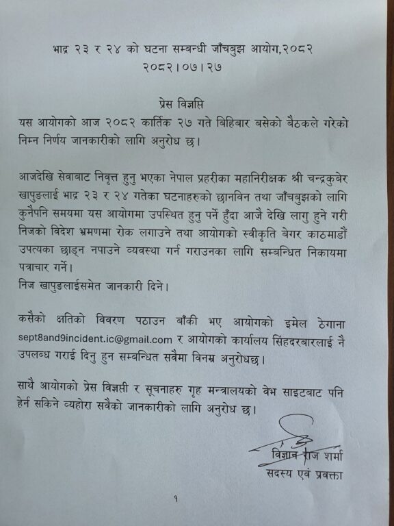 काठमाडौं – निवर्तमान प्रहरी महानिरीक्षक (आईजीपी) चन्द्र कुबेर खापुङलाई विदेश भ्रमण र काठमाडौं उपत्यका छाड्न रोक लगाइएको छ। २३ र २४ भदौमा भएका घटनासम्बन्धी छानबिन गर्न गठित उच्चस्तरीय जाँचबुझ आयोगले निवर्तमान आईजीपी खापुङलाई विदेश भ्रमण र काठमाडौं उपत्यका छाड्न रोक लगाउने निर्णय गरेको हो।