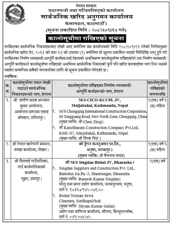 काठमाडौं – प्रधानमन्त्री कार्यालय मातहतको सार्वजनिक खरिद अनुगमन कार्यालयले पाँच वटा निर्माण कम्पनीलाई कालो सूचीमा राखेको छ। कार्यालयले आज सूचना जारी गर्दै विभिन्न निकायबाट कालोसूचीमा राख्नको लागि लेखि पठाएअनुसार ती निर्माण कम्पनीलाई कालोसूचीमा राखिएको जानकारी दिएको हो।