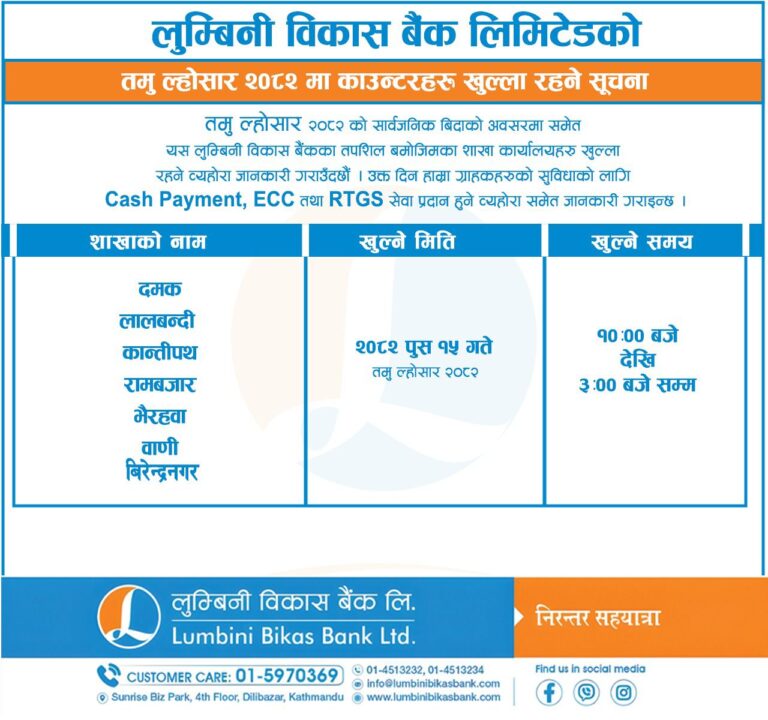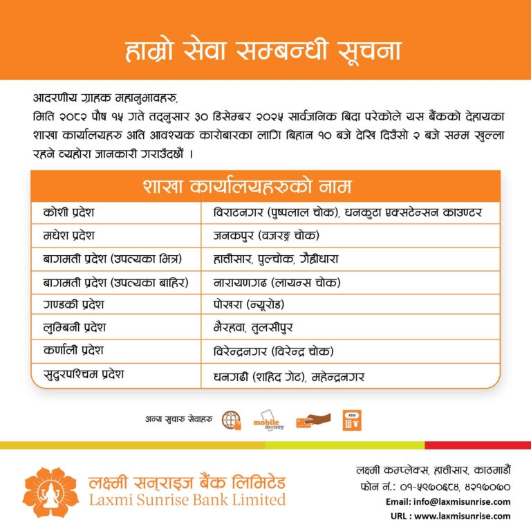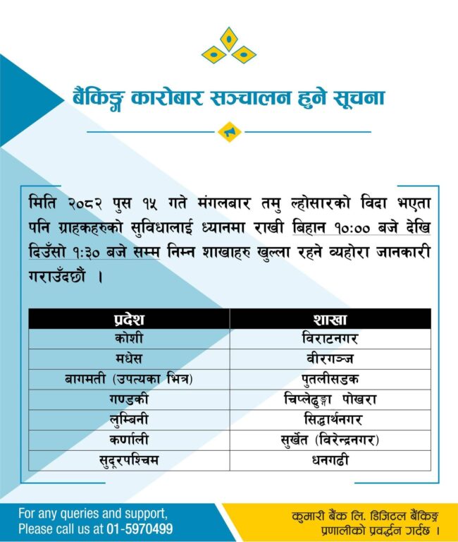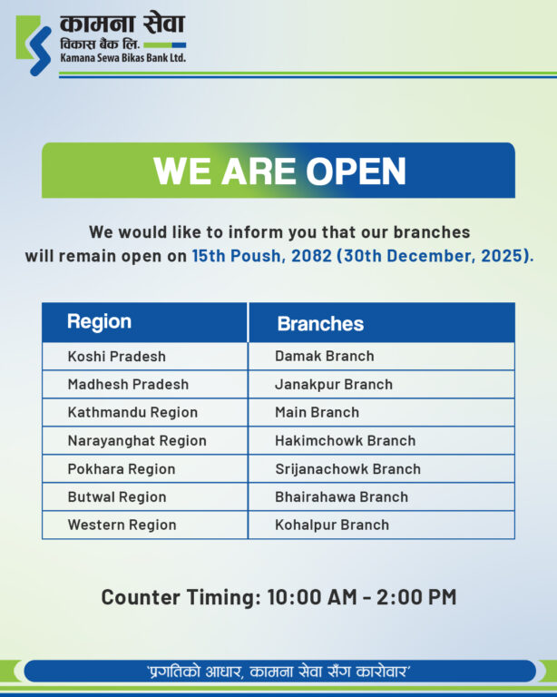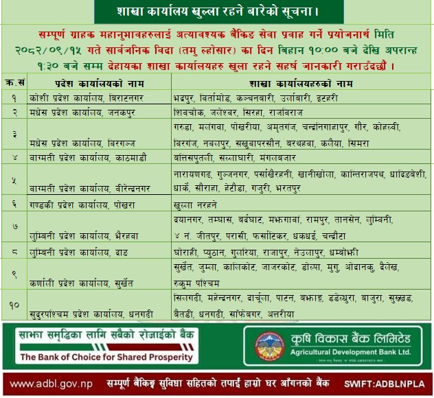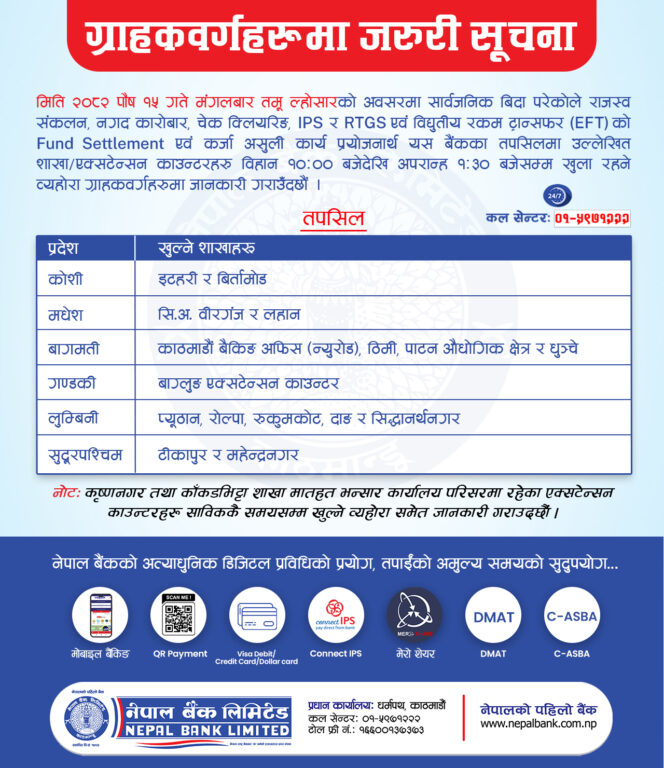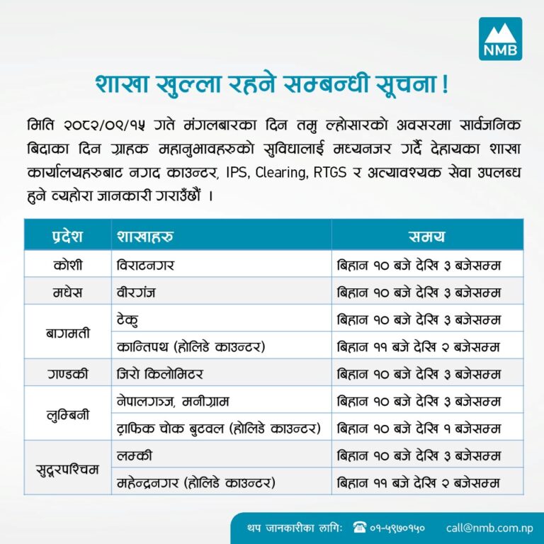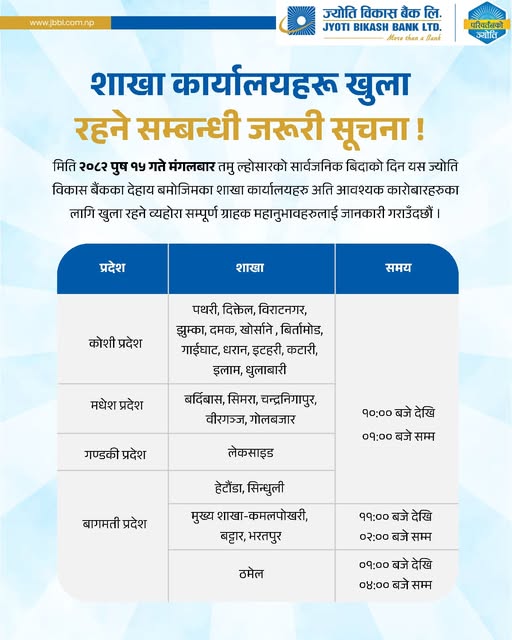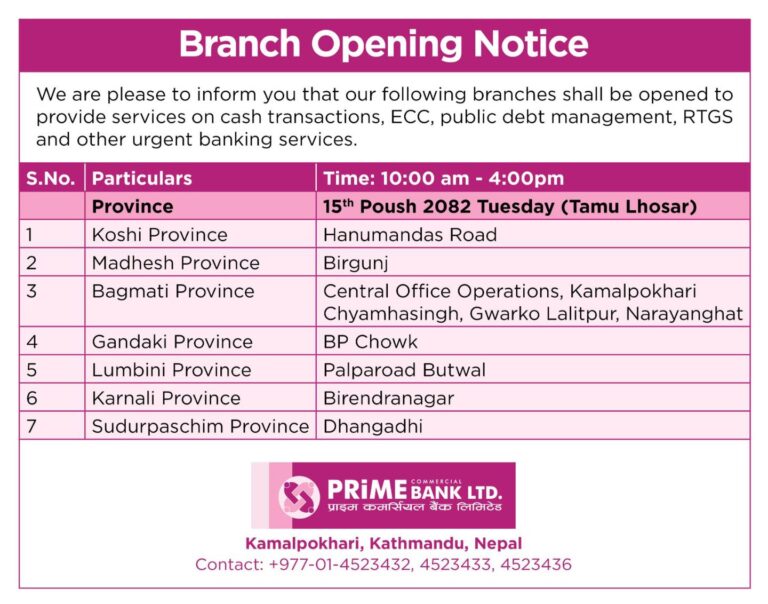राजस्व संकलन, नगद कारोबार, चेक क्लियरिङ, विद्युतीय रकम ट्रान्सफर तथा कर्जा असुली कार्य प्रयोजनार्थका लागि बैंकका सिमित शाखा खुल्ने जनाएका छन् ।