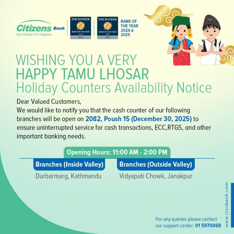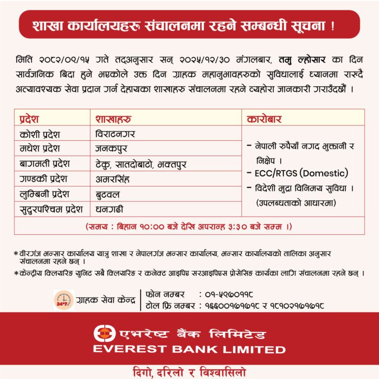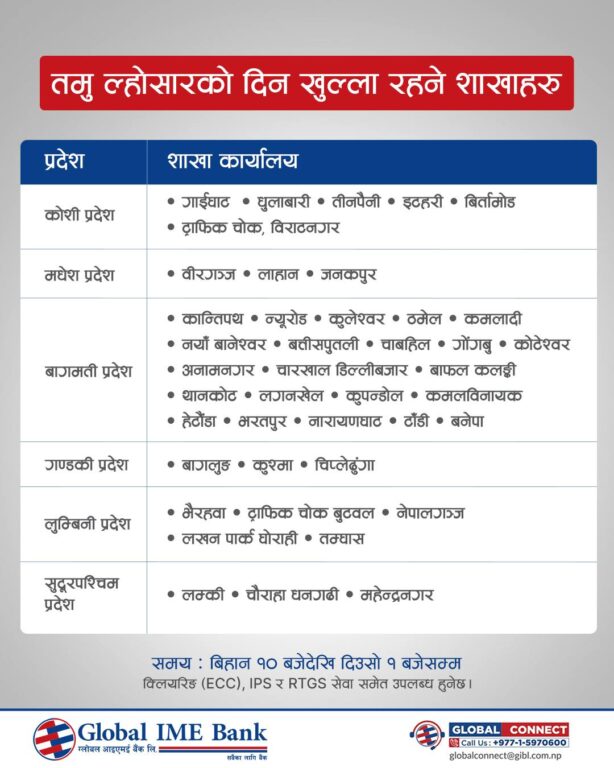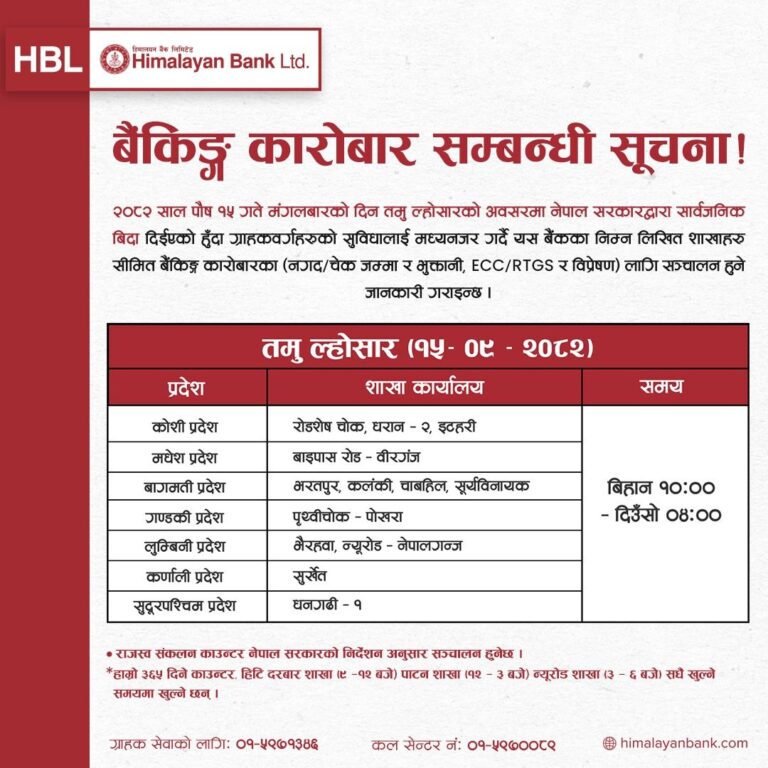काठमाडौं – आज तमु ल्होसारका दिन देशभर सार्वजनिक बिदा छ । बैंकहरुले भने सार्वजनिक बिदाको दिनमा पनि आफ्ना ग्राहकको आवश्यकतालाई मध्यनजर गर्दै सिमित शाखाबाट बैंकहरुले र्बैकिङ्ग सेवा दिने भएका छन् । बैंकहरुले होलिडे काउन्टरमार्फत बैंकिङ्ग सेवा दिने भएका हुन् ।