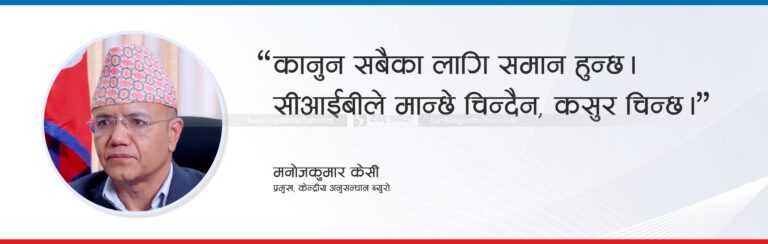 बैंकिङ्ग कसुरका घटनामा अनुसन्धान जिम्मेवारी पूर्णरुपमा केन्द्रीय अनुसन्धान ब्युरो मातहत आउने सीआईबीका प्रमुख केसी बताउँछन्। जसले गर्दा बैंकिङ्ग कसुरको अपराधमा सर्वसाधाणलाई जस्तो सजाय हुन्छ, सोही अनुसन्धान प्रकियामा माथिल्ला तहका व्यक्तिहरूलाई समेत अनुसन्धान गरिन्छ। कसुर सबैका अपराधिक कियाकलापमा संलग्न व्यक्तिका लागि समान हुने गर्छन्।